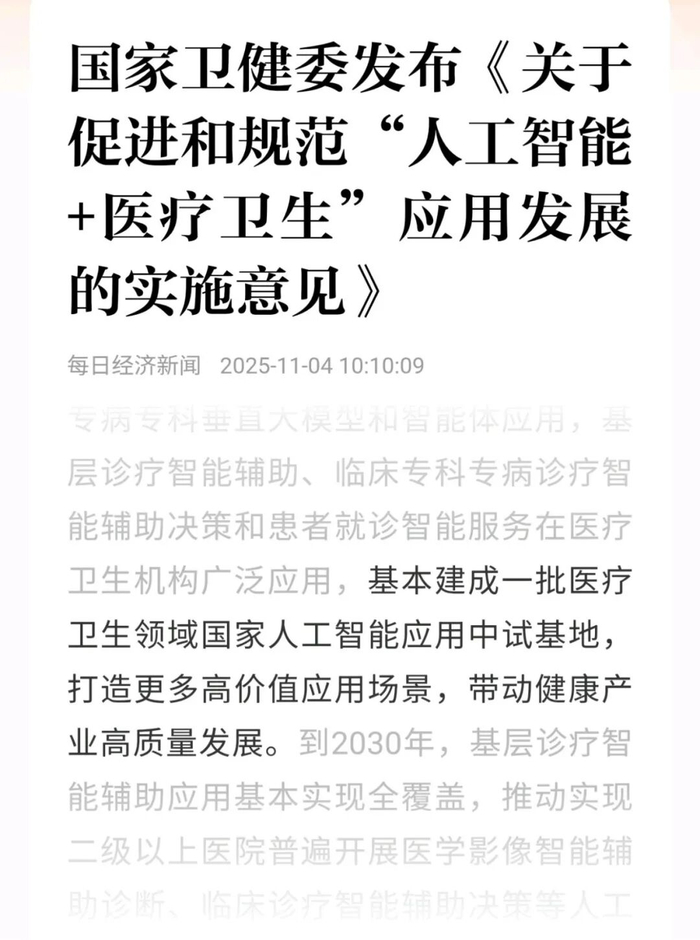 正因为空间巨大,国家将医疗作为“人工智能+”行动重要一环,以国家AI医疗应用中试基地为抓手。