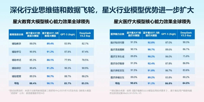 就在上个月,科大讯飞发布基于全国产算力的深度推理大模型讯飞星火X1.5,推动讯飞星火医疗大模型再次升级,在医学知识问答、医疗语言理解、医疗文书生成、诊疗推荐、多轮交互及多模态交互等能力维度,效果全面超越GPT-5(high)及DeepSeek V3.2-Exp。